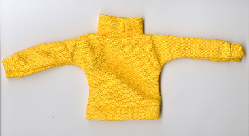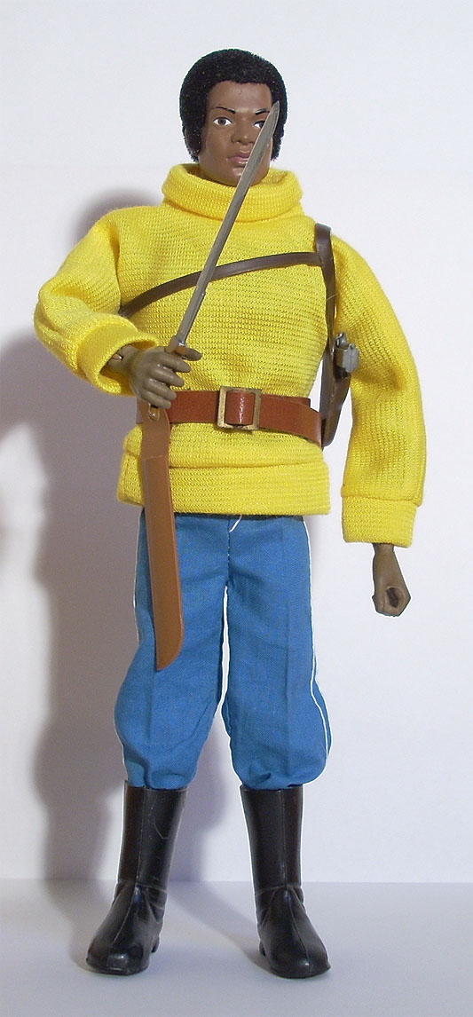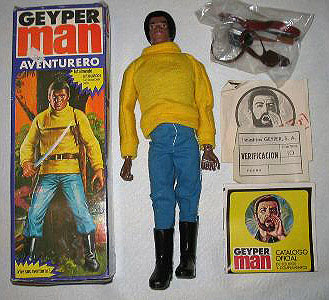 Muñeco Geyperman negro, suéter amarillo, pantalón, botas altas, cinturón, funda sobaquera, pistola Colt 45, machete y funda machete.