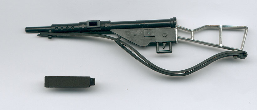 gorro, botas negras, puñal, cantimplora, subfusil Sterling, sobaquera y