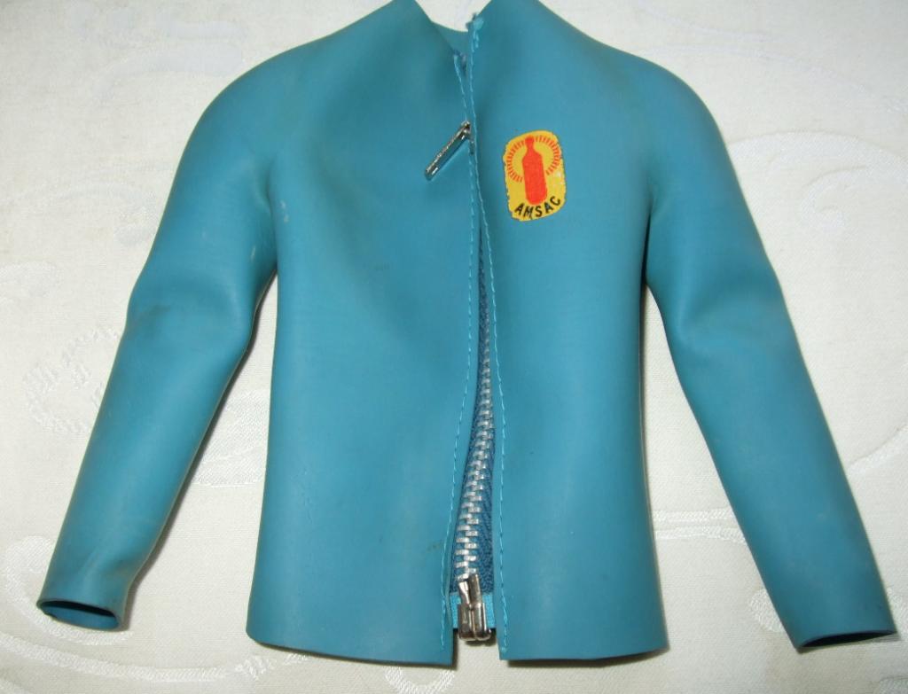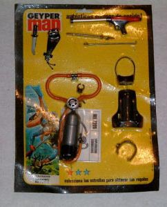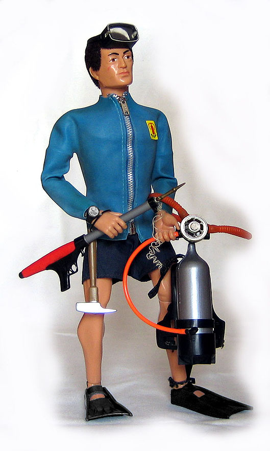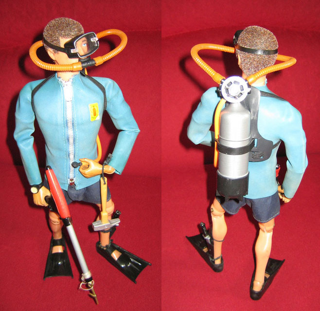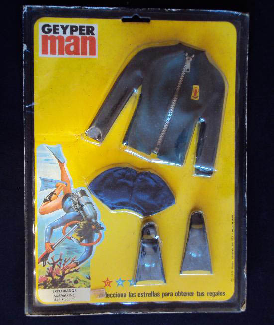 Chaqueta, pantalón, aletas, gafas, reloj, puñal,