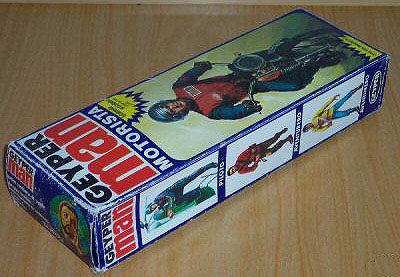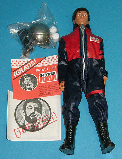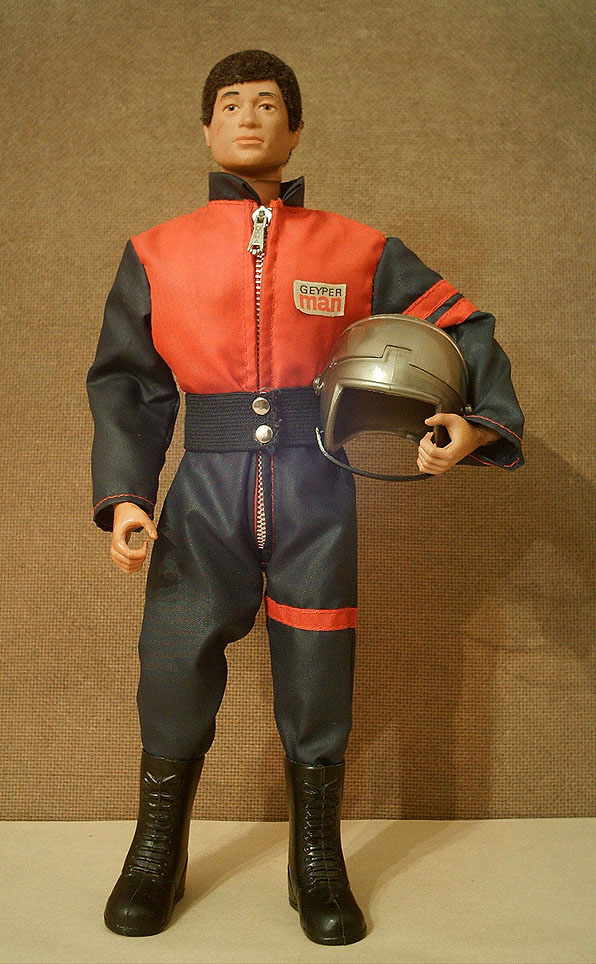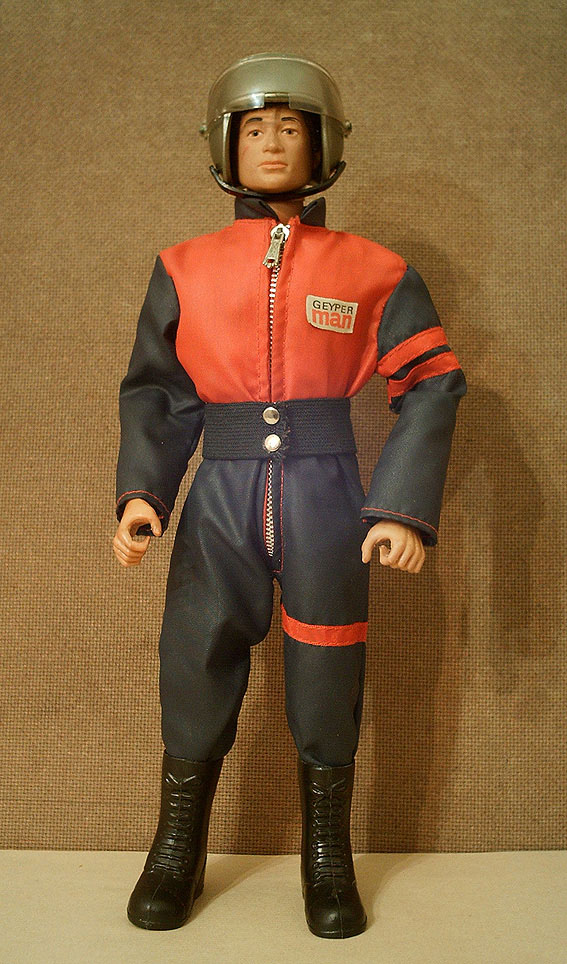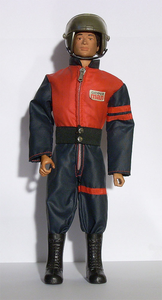 Muñeco Geyperman, mono, botas altas negras, faja y casco.