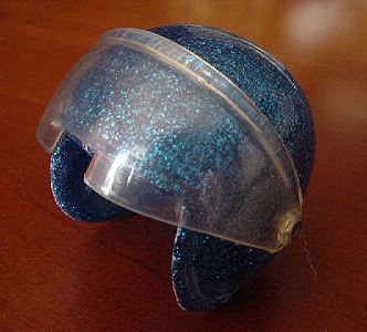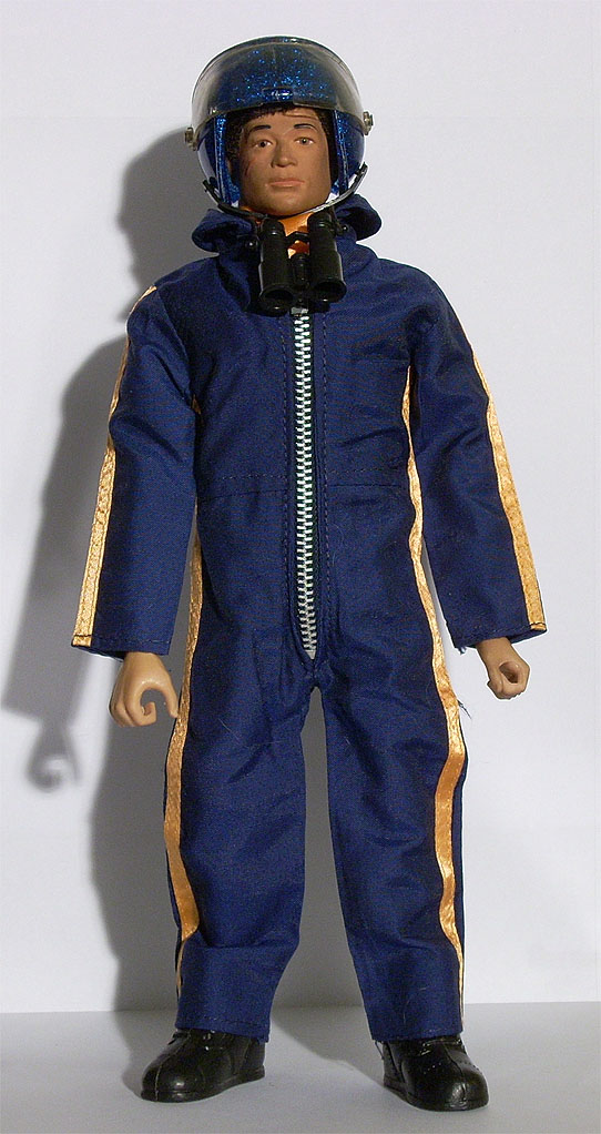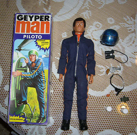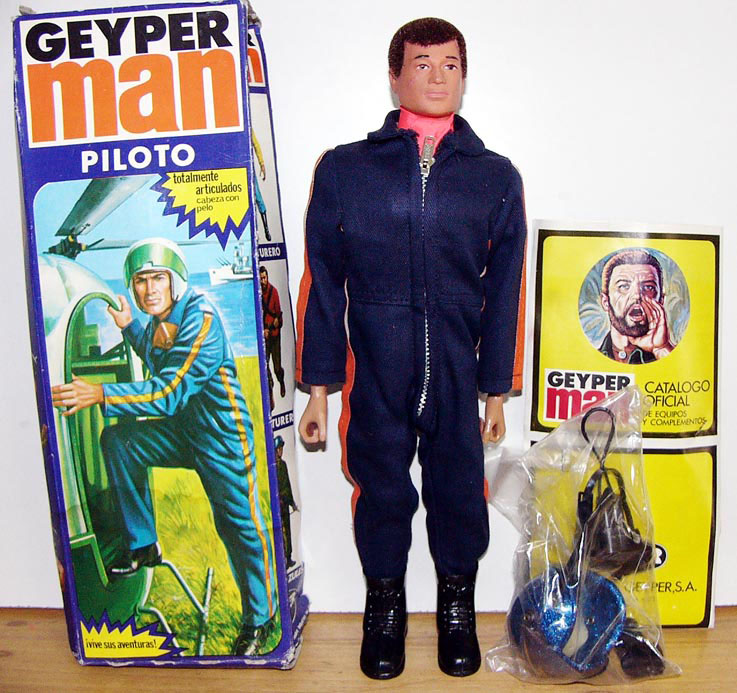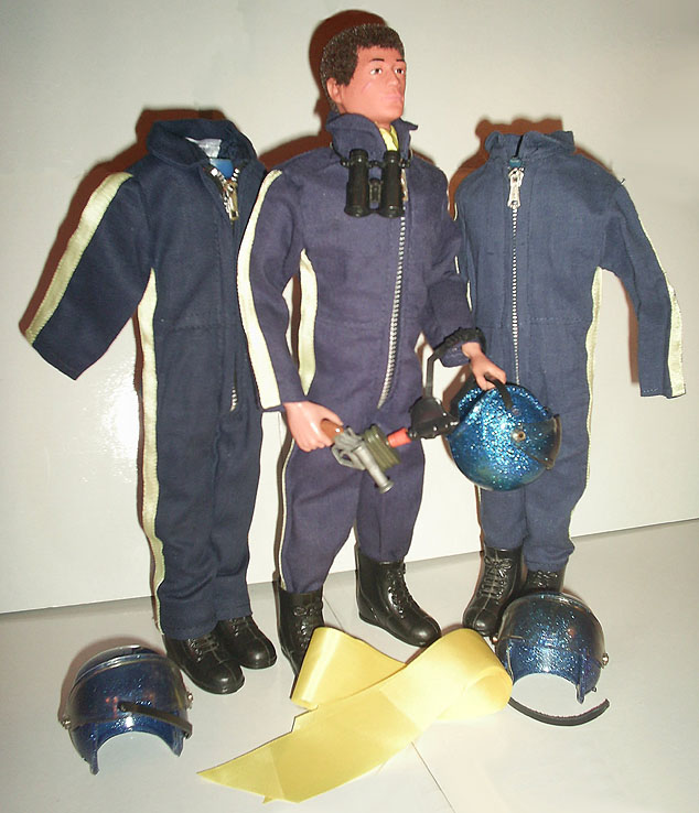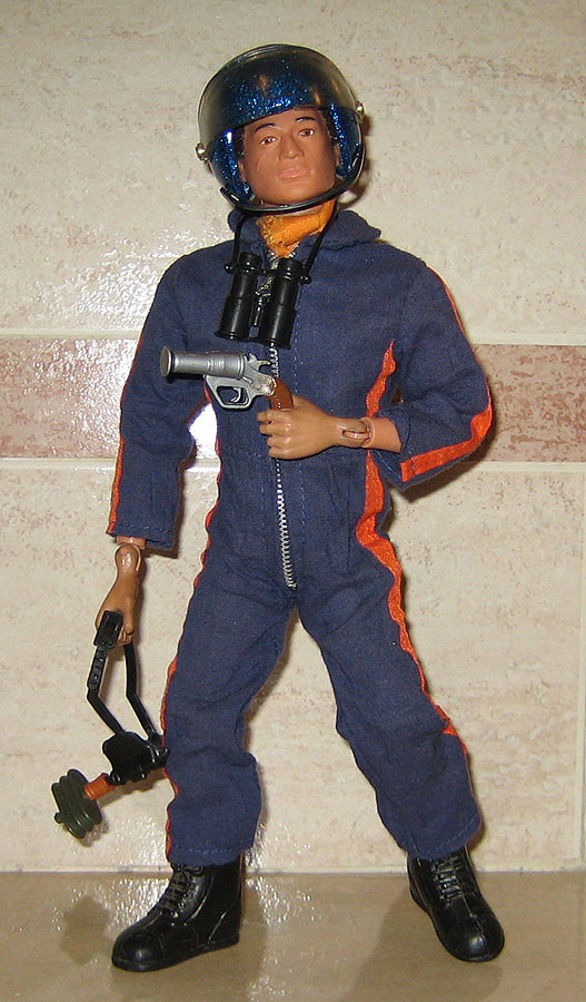 Muñeco Geyperman, mono azul, pañuelo de cuello, botas negras, prismáticos, casco, mascara de oxigeno y pistola de señales.