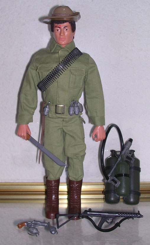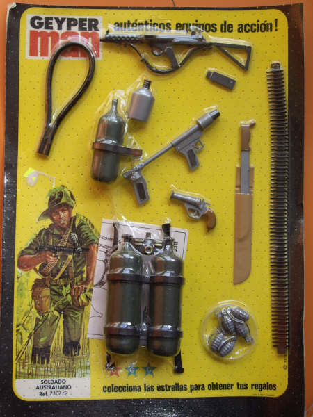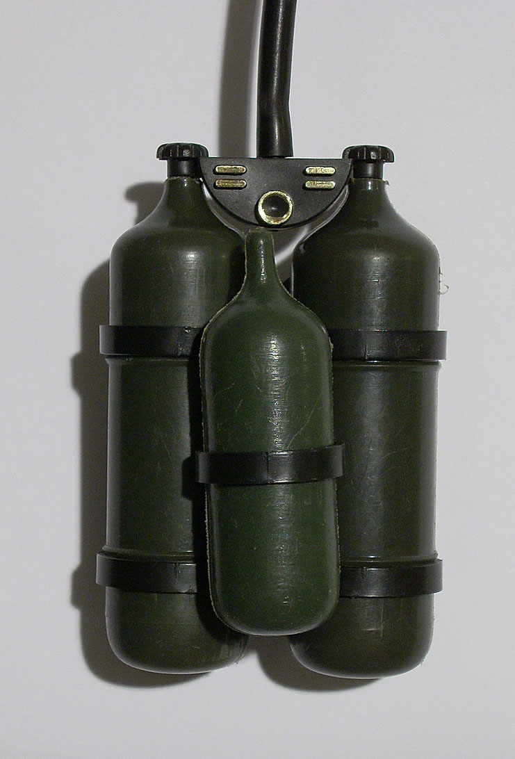 señales, cantimplora, subfusil Sterling, fusil lanzallamas, bombonas lanzallamas y manguera. |