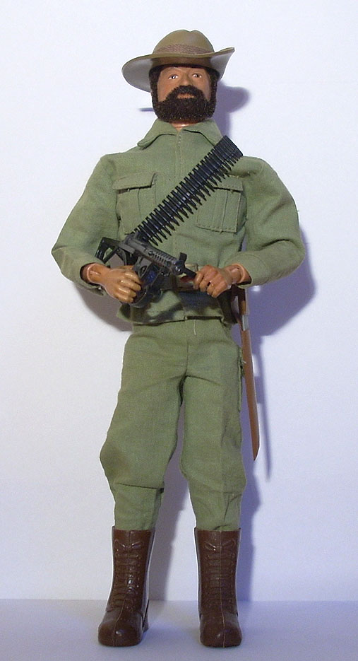 pantalón, sombrero, cinturón, botas altas marrones, canana y subfusil