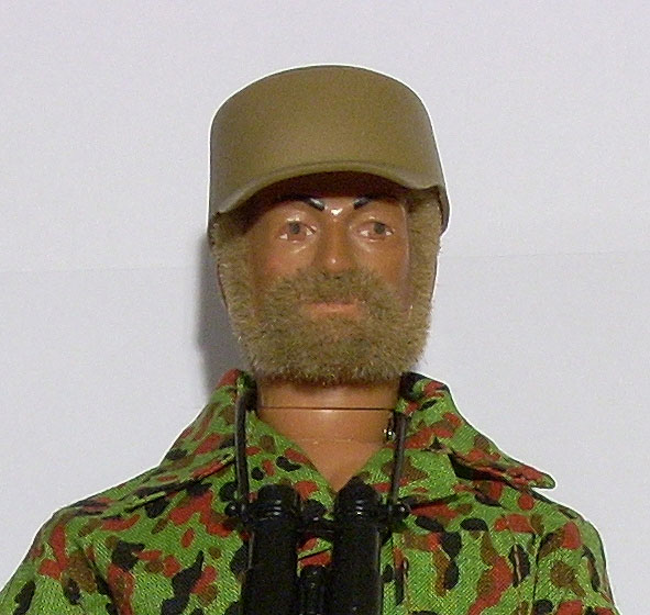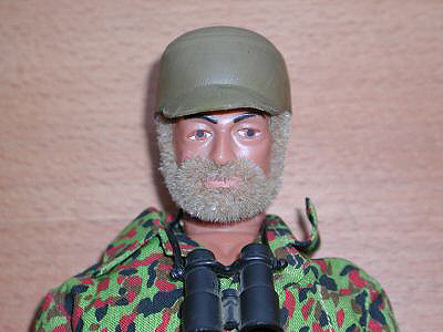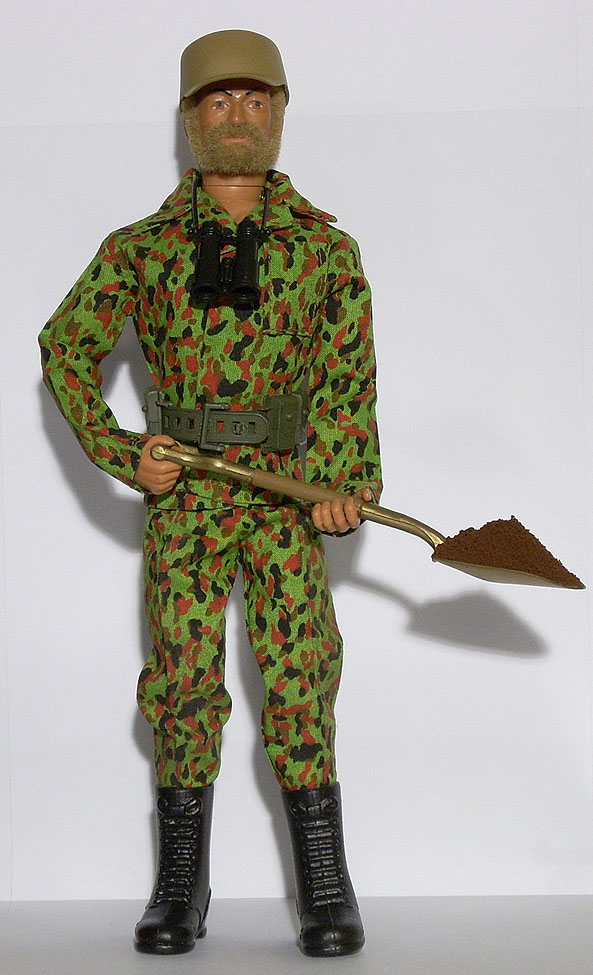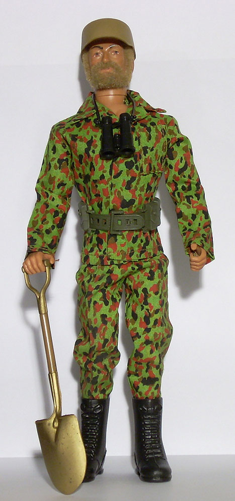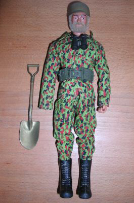 Muñeco Geyperman, guerrera y pantalón de camuflaje, gorra, botas altas negras, cinturón, 2 cartucheras, prismáticos y una pala.