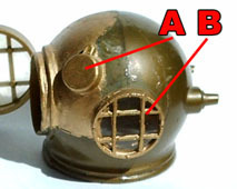 ![]() Hecho esto, hice un molde de la parte exterior, con yeso, y una vez seco quite toda la plastelina y lo limpie bien. Desde dentro aplique fibra de vidrio, y una vez seca quite el yeso, que me costo muchísimo, con silicona hubiera sido mas fácil, y el acabado mejor. La tapa lateral "letra B en la foto", la hice sacando un molde de la del otro lado, y utilice la resina de la fibra de vidrio. El bulto "letra A en la foto", lo hice mas tarde, cuando cayo en mis manos un casco completo, al que le hice un molde de esta parte, con silicona corriente, una vez seca la puse encima, en la posición adecuada en mi casco, al que previamente le había hecho un agujero en el centro de donde tenia que ir el bulto, y por donde le eche un poco de resina, por dentro del casco, hasta llenar el hueco. Una vez seco, sin apenas lijar, para no dañar la parte original, pinte la parte nueva, con un color parecido. |