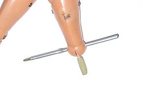 dibujar el circulo, nos ayudaremos del compás. Aprovechando la marca de la aguja del compás, la usaremos de guía, para hacer el agujero, con una broca de 3mm, luego valiéndonos del cutter, recortaremos la pieza dejando un poco de margen, para acabar de perfeccionarlo con una lima. La parte que tendrá que ser cilíndrica, la dejaremos un poco mas estrecha, asi cuando coloquemos la masilla, la envolvera por completo. Y procedemos a poner la masilla, procurando que quede a la medida justa, y una vez seca, si a quedado un pelín grande, la lijaremos asta que entre en la extremidad bien ajustada (también podríamos ponerle un tubito, rellenando el interior con pegamento de dos componentes). |